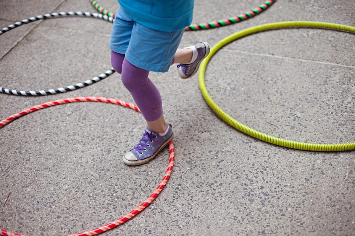 Place the same numbered balloons in hula hoops spread out across a